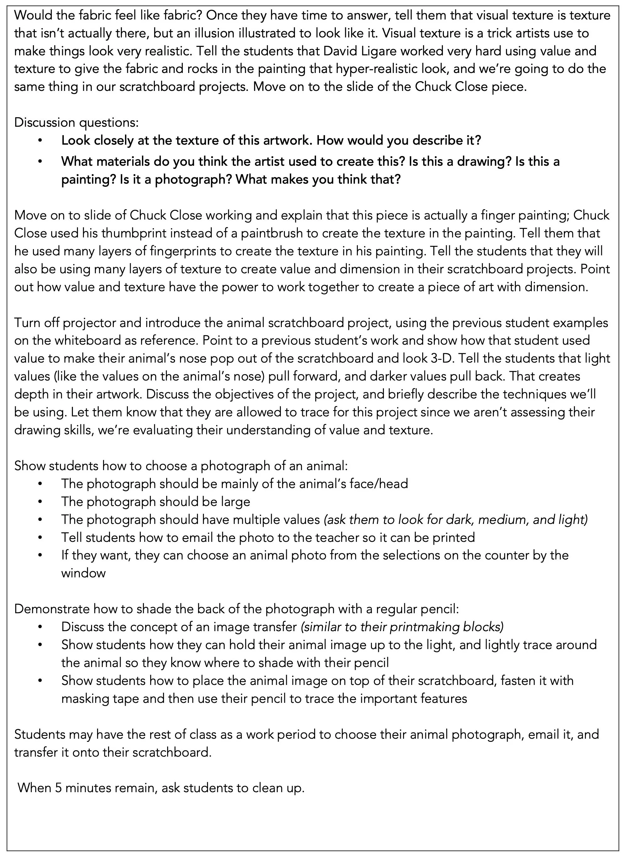 Students will learn the difference between actual texture and visual texture through an investigation of two artworks, discover how texture and value can work together to create dimension, then use their new skills to create an artwork of an animal on scratchboard.